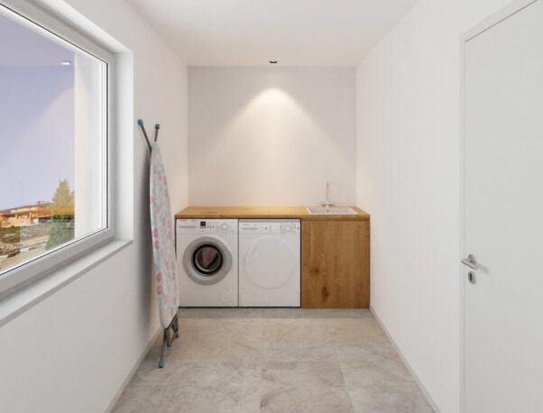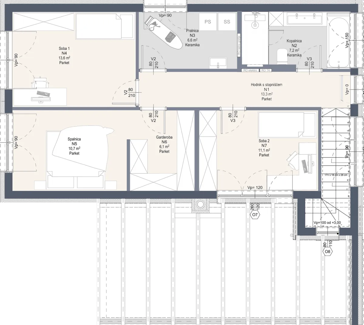 Tloris nadstropja hiš v soseski Lipa je zasnovan z namenom zagotoviti zasebnost in udobje, s tremi svetlimi sobami, ki vsakemu družinskemu članu omogočajo kotiček miru. Glavna spalnica vključuje lastno garderobo (možnost “walk-in”), medtem ko druge sobe ponujajo fleksibilen prostor za otroke ali goste. Prostorna kopalnica in pralnica zagotavljata funkcionalnost in organiziranost v vsakdanjem življenju.